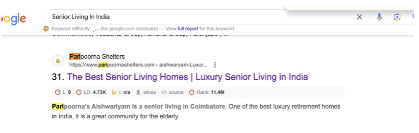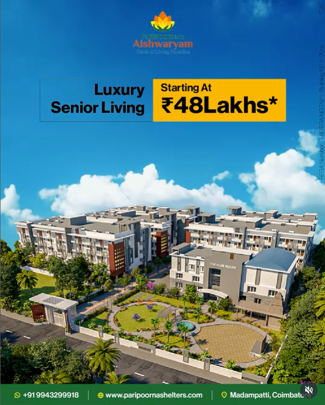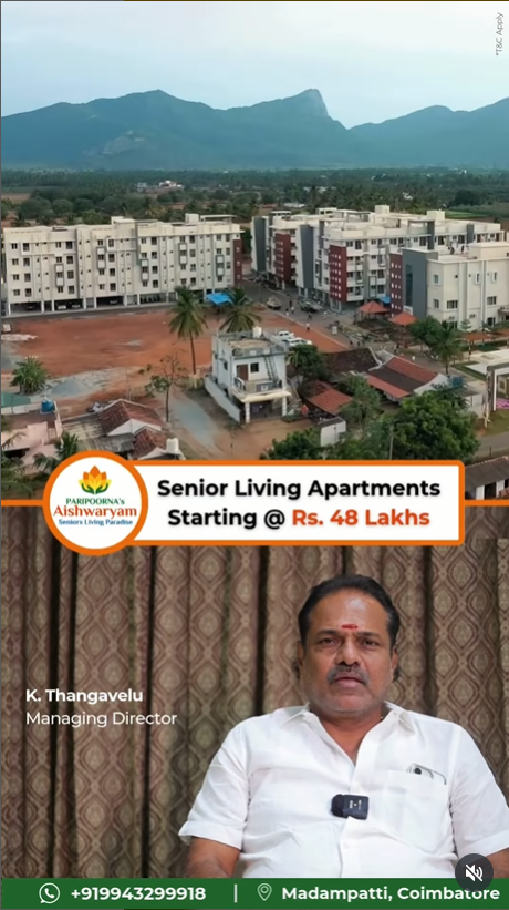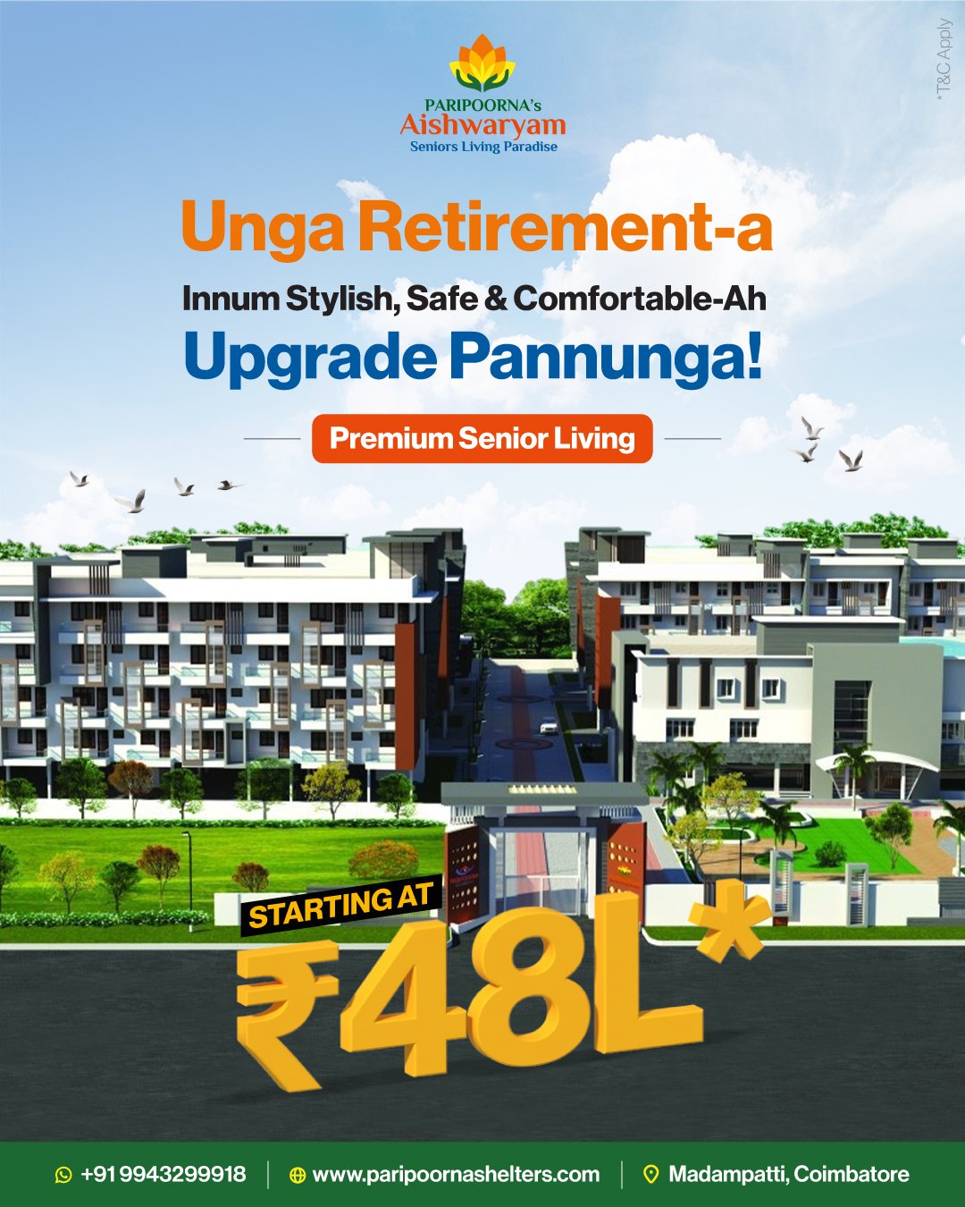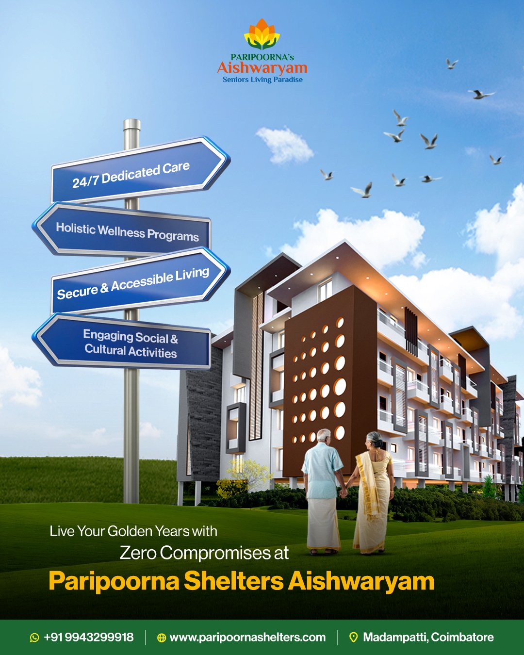 Paripoorna Shelters (P) Ltd. develops premium senior living communities under Aishwaryam Seniors Living Paradise. Backed by a seasoned team, their projects across South India reflect unmatched quality, thoughtful design, and specialized services. Paripoorna is committed to creating safe, comfortable, and enriching lifestyles for seniors through every project they build. Learn More